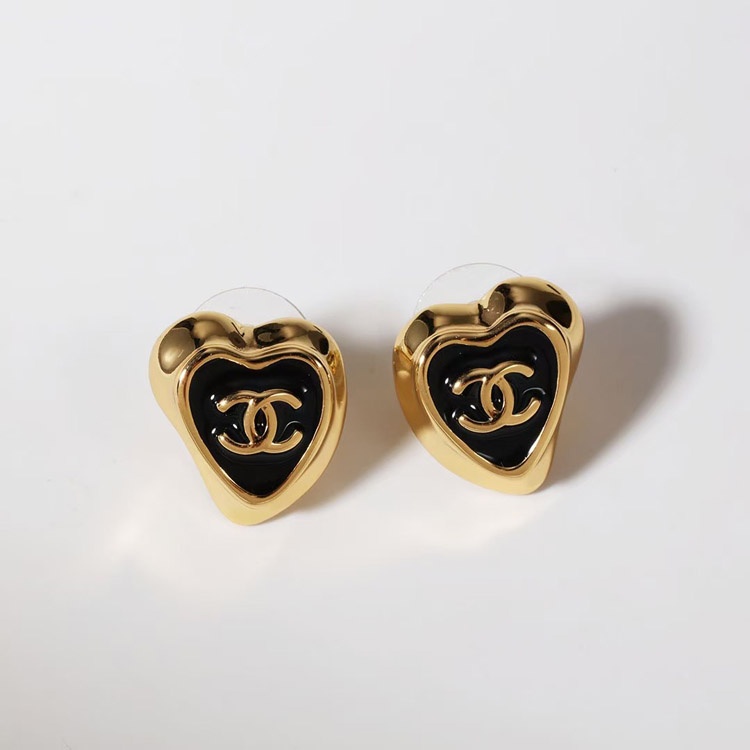Chanel black enamel love double C gold edge earrings-3739